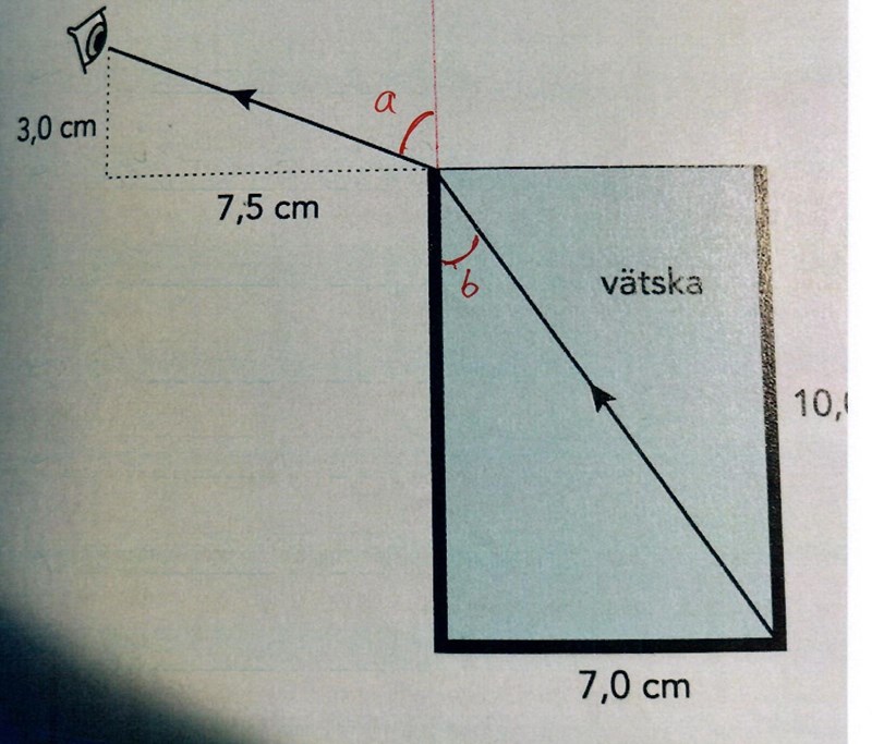 efter att: n*sin(arctan(10/7)) = 1*sin(arctan(3/7.5)) --> n=0.45