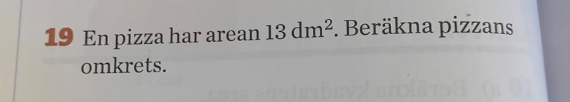 Du tänker helt rätt! Arean ges som du säger av . Här vet vi att pizzans area är 13 kvadratdecimeter. Det ger oss ekvationen . Som du skriver, vi dividerar arean med pi, så att vi får kvar: