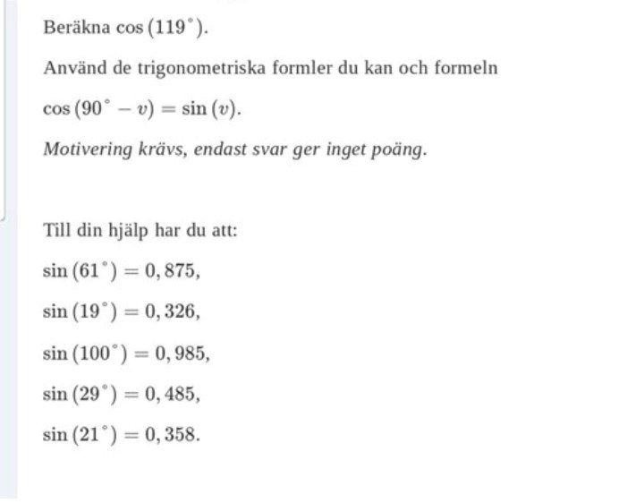 Nu såg jag i uppgiften att man skall använda sambandet cos(90o-v) = sin(v) istället, så då man justera resonemanget en aning.