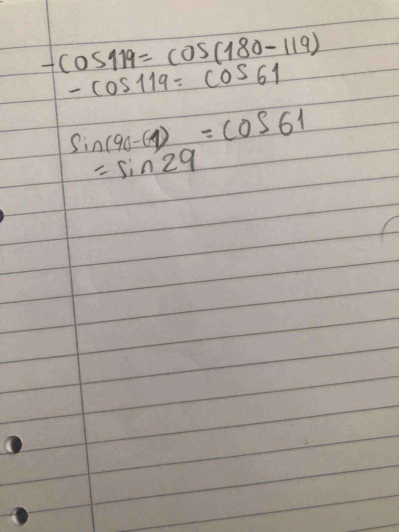Cos(119)=sin(90-119)=sin(-29) leder till