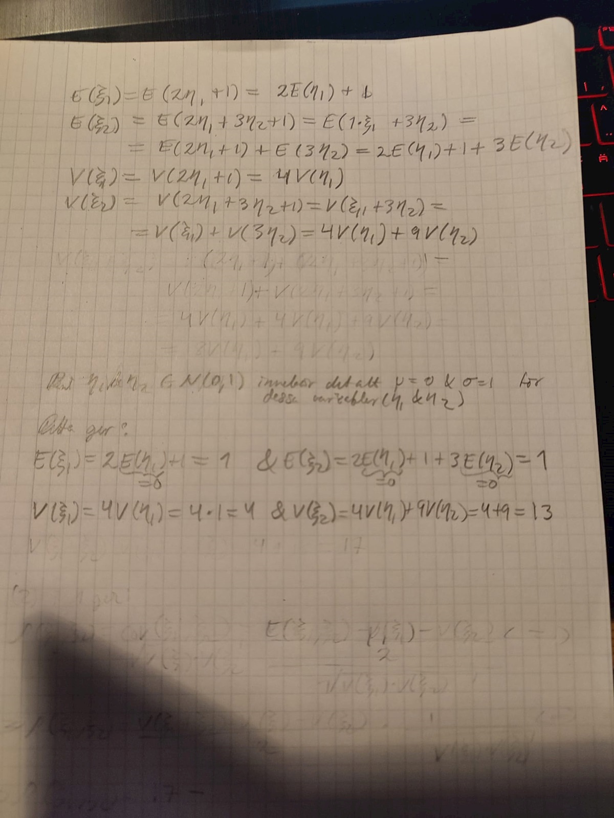 Jag ser inte riktigt vad de skrivit i metod 1? de skriver att Cov(xi1,xi2) = cov(2eta1+1,2eta1+3eta2+1) = 4var(eta1) + 6cov(eta1 ?eta2) . Efter likamedtecknet efter 6cov(...) ser jag inte vad de skrivit? sedan förstår jag inte varför det blir 6cov?