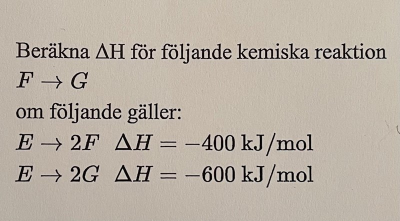 Om det inte hade stått en 2a framför F och G hade jag vetat precis hur man gör för att lösa uppgiften, (då hade jag bara adderat ihop -400 kJ/mol med -600 kJ/mol) men eftersom att dem 2:orna just står där så vet jag inte hur jag ska göra… Jag skulle uppskatta om någon skulle vilja förklara det för mig!