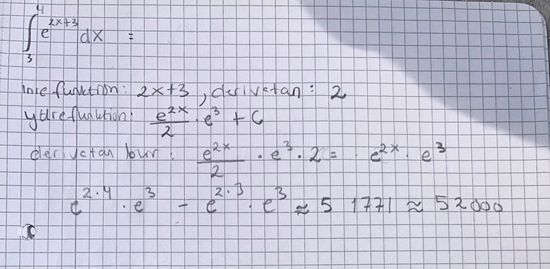 Hej. Jag undrar hur man ska tänka här. Det jag har gjort är att jag har deriverat e^2x+3 med hjälp av kedjeregeln . Därefter satte jag in 4 och 3 i uttrycken.. Är det rätt eller fel tänkt? Hur ska man tänka här?
