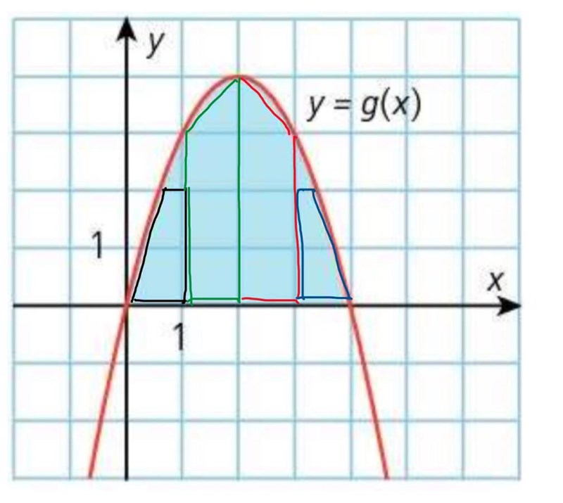 Beräkna den blå arean med trapetsformeln och fyra intervall