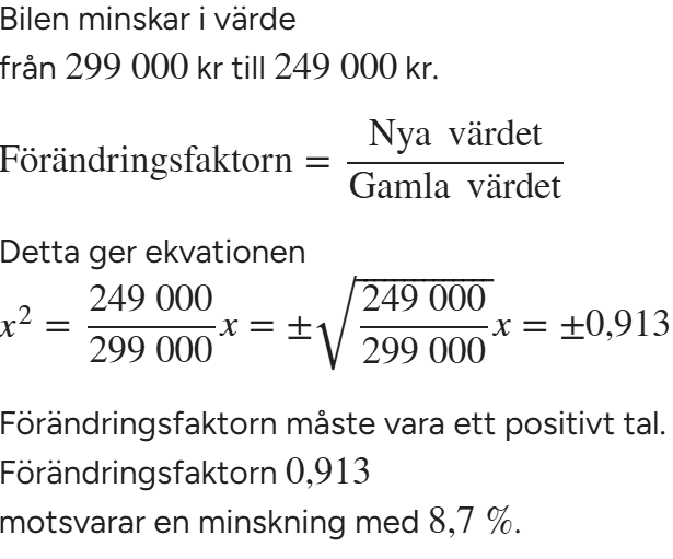 Använd förändringsfaktor. Om en bil kostar 100 000 kan dess nya värde efter 1 år beräknas . Efter 2 år blir det , 3 år osv. Den årliga procentuella förändringen ges faktiskt av . Hur kan du ställa upp en ekvation enligt det som är givet i uppgiften?
