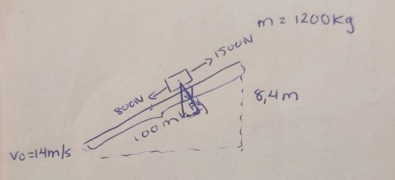 En bil med massan 1200 kg kör uppför en rak backe som är 100 m lång. Då kommer bilen 8,4 m högre upp i terrängen. Förutom tyngden är det två krafter som utför arbete på bilen: en dragkraft framåt på 1500 N och friktionskrafter bakåt på 800 N. Längst ner i backen är hastigheten 14 m/s. Beräkna den mekaniska energin som bilen har längst upp i backen. (Lägg nollnivån längst ner i backen)