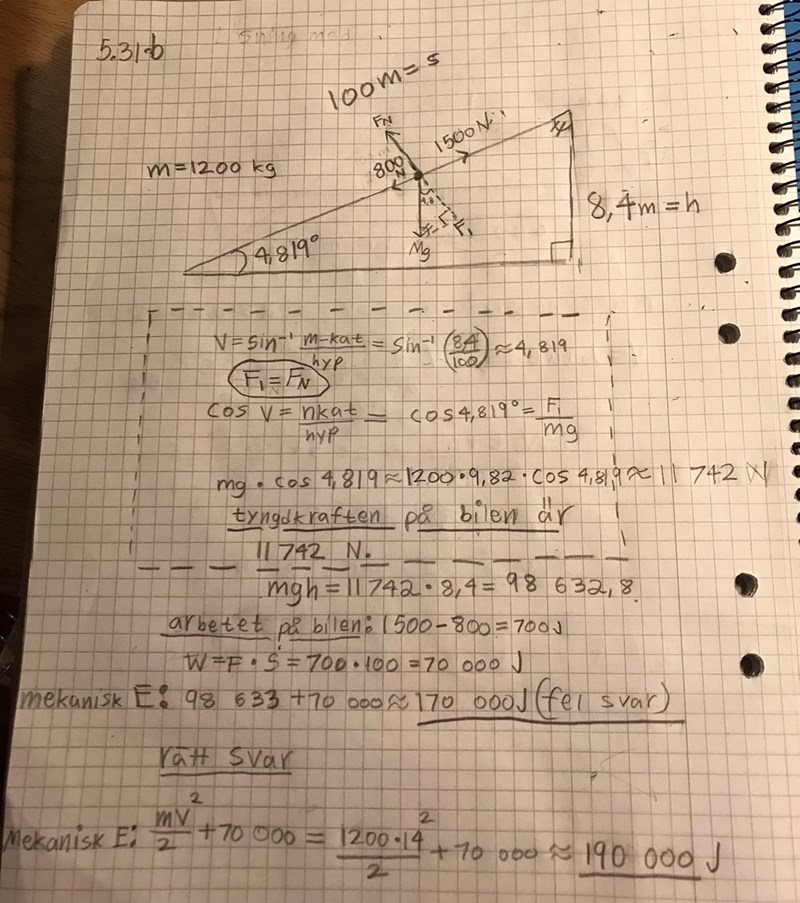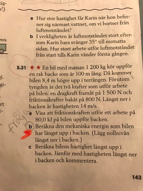 Beräkna den mekaniska energin som bilen har längst upp i backen. Varför funkar inte båda sätten?
