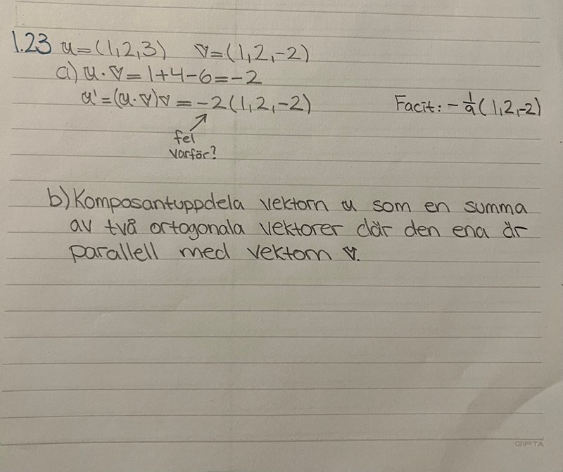 Det som står i rubriken är precis vad man ska göra i a). Varför får jag fel värde? Jag får -2 när jag tar u • v , ska man inte göra det?