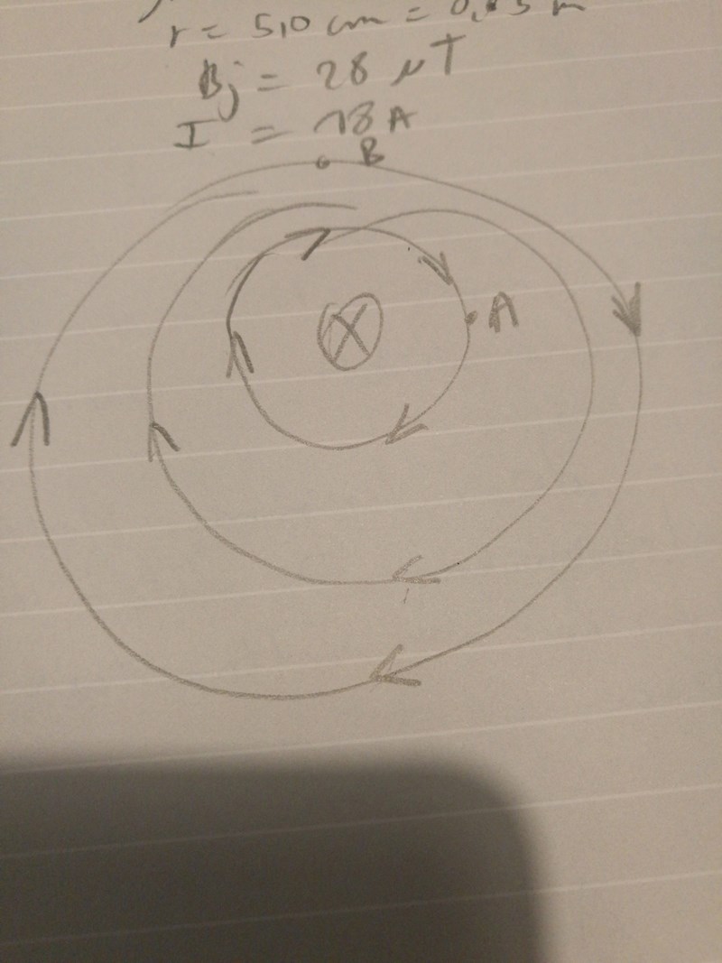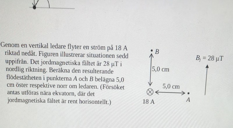 ThomasN skrev:Magnetfältet från ledaren i punkt A är nedåt, precis som du ritat.