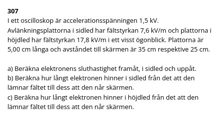 Hej, på a, uppgiften, hur ska jag göra där? Så hastigheten rakt fram blir 22970103.14m/s pga Uq=mv²/2. Om jag inte har uppfattat det fel är hastigheten i x-led (vx) alltid detsamma. Så elektronen kommer att röra sig med denna hastighet igenom hela oscilloskopet.