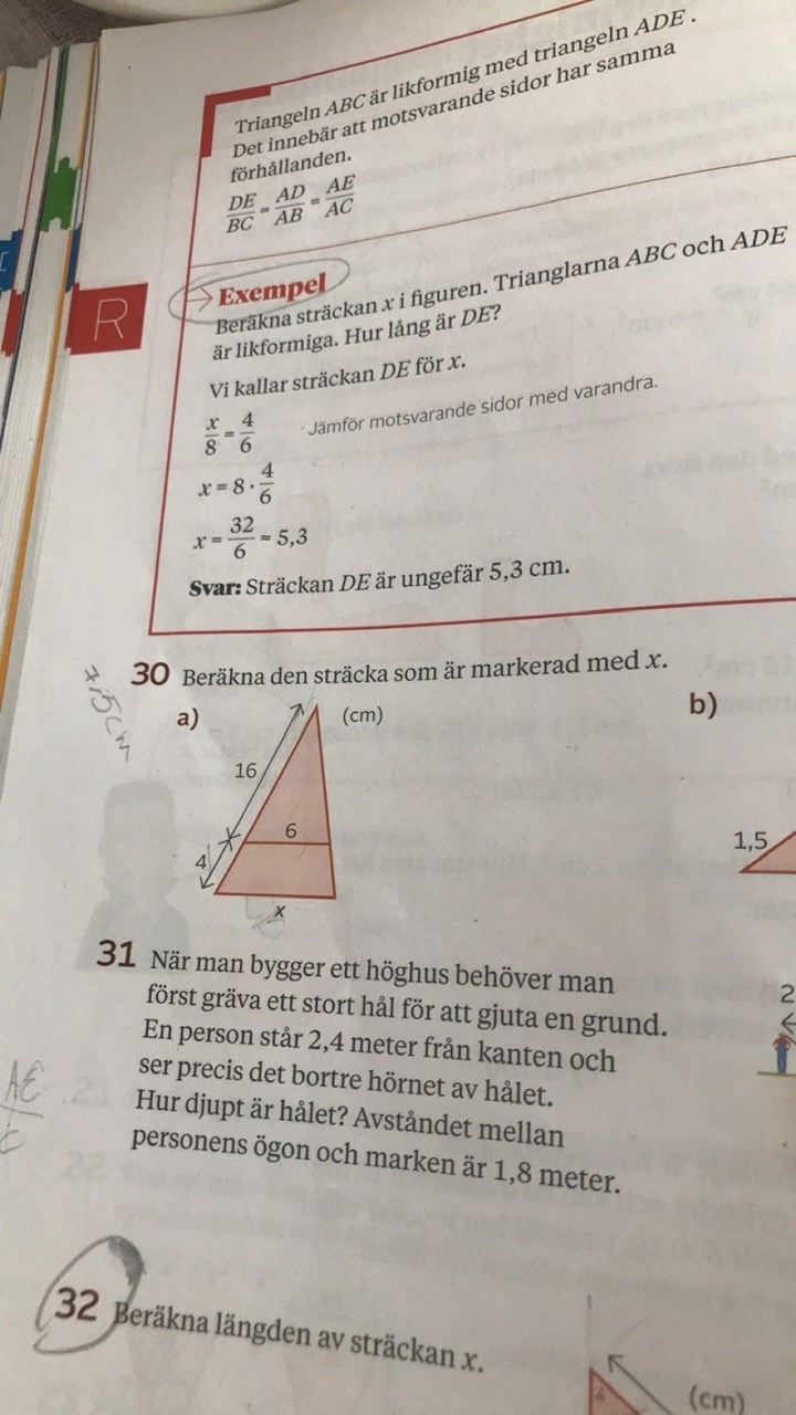 Fråga 30 a) jag har tänkt att 6/4 och 6/x sedan räknar jag ut och får 6*6/4 men det är fel i facit stor det 7,5 och jag fick 9