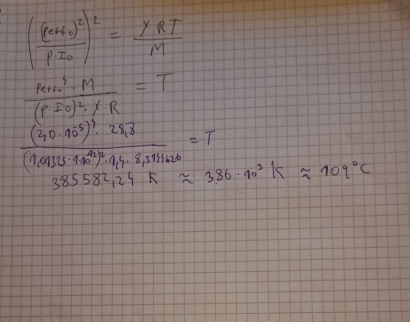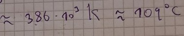 Gällande 109 grader så var det knappfel på räknaren , jag avrundade svaret till 386*10^3 K och subtraherade med 273.15 K så det blev 109 grader. Kanske kan det vara så att jag inte hade parentes runt 386*10^3