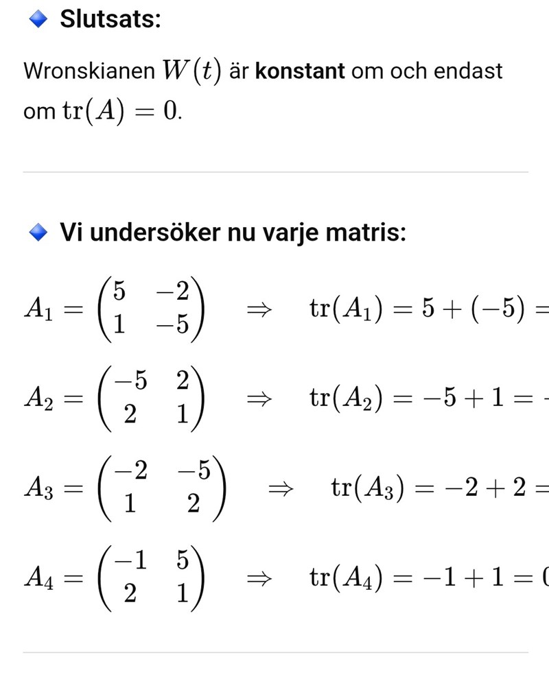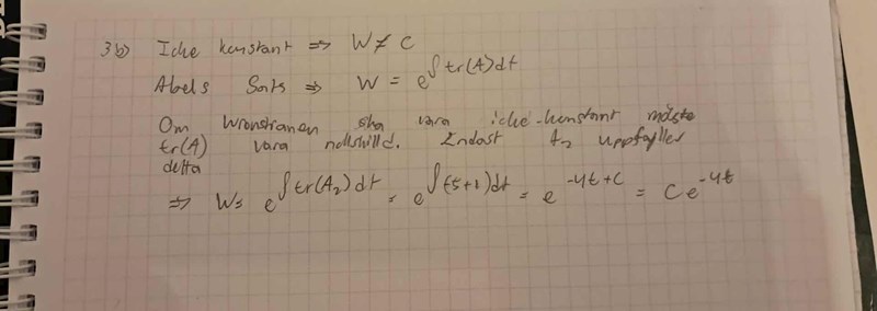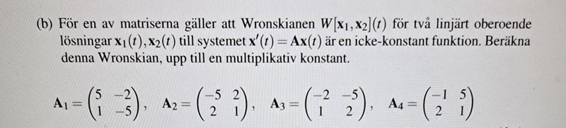 Jag var väldigt förvirrad när jag försökte lösa denna uppgift och försökte använda vanliga W[y1,y2] för samtliga matriser efter ha funnit egenvärden och motsvarande egenvektor, men det tog betydligt lång tid och då kom jag bara fram till att A4 har en icke konstant funktion som W. Men jag undrar om det finns en lättare sätt att se detta problem på? Mitt försök tog mer tid än vad det behöver göra.
