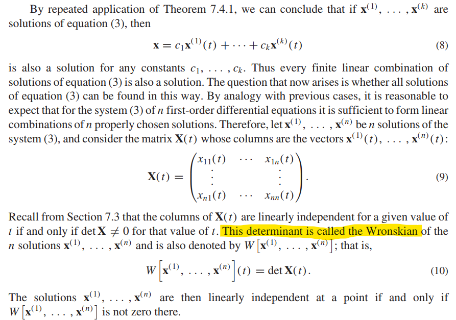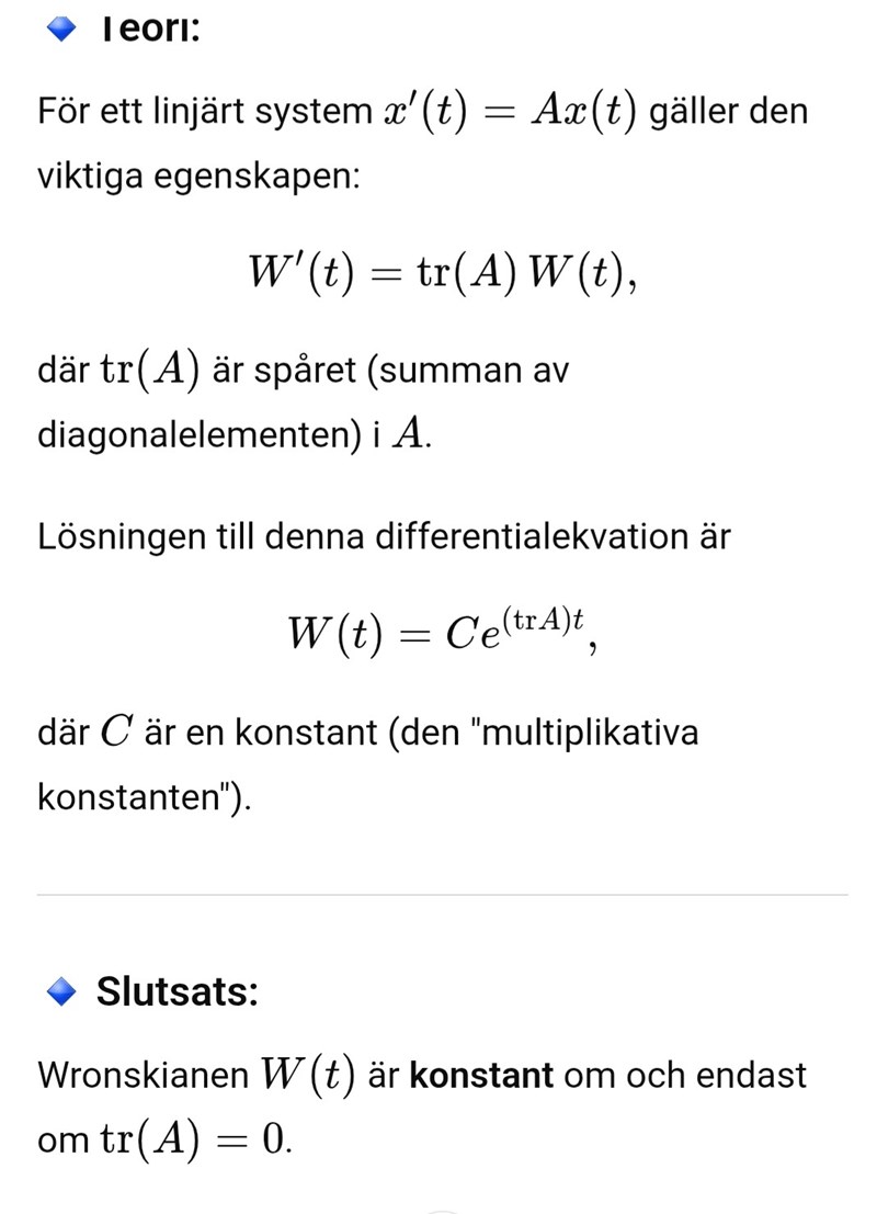 LuMa07 skrev:Tänk på strukturen av lösningarna till ett linjärt ODE-system och strukturen på Wrońskianen.