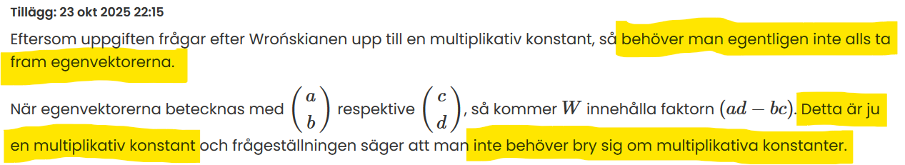 Eftersom uppgiften frågar efter Wrońskianen upp till en multiplikativ konstant, så behöver man egentligen inte alls ta fram egenvektorerna.