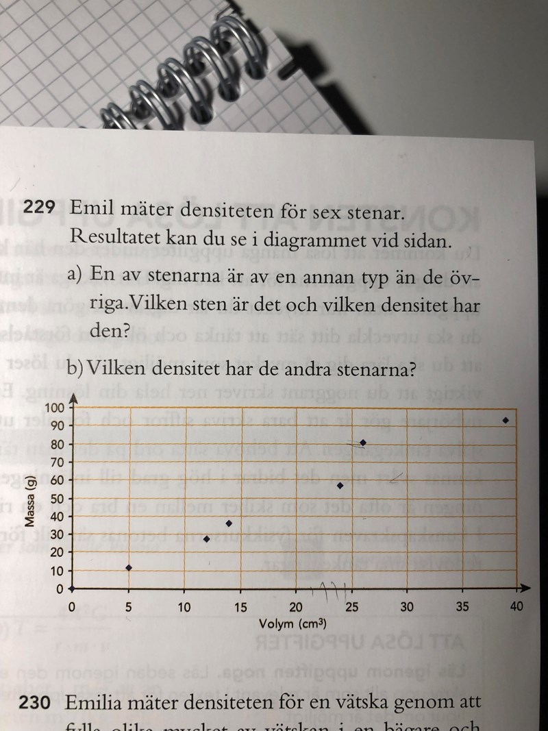 Jag har en uppgift där jag har löst uppgift a men b-uppgiften verkar lite skum... Jag kan givetvis inte se exakta värden genom diagrammet men på ett ungefär... Jag har beräknat en ungefärlig densitet för samtliga stenar och sten 5 som väger ca 82 g och har en ungefärlig volym på 26cm^3 har jag svarat i a-uppgiften. Jag beräknar densiteten för resterande stenar och använder mig av: