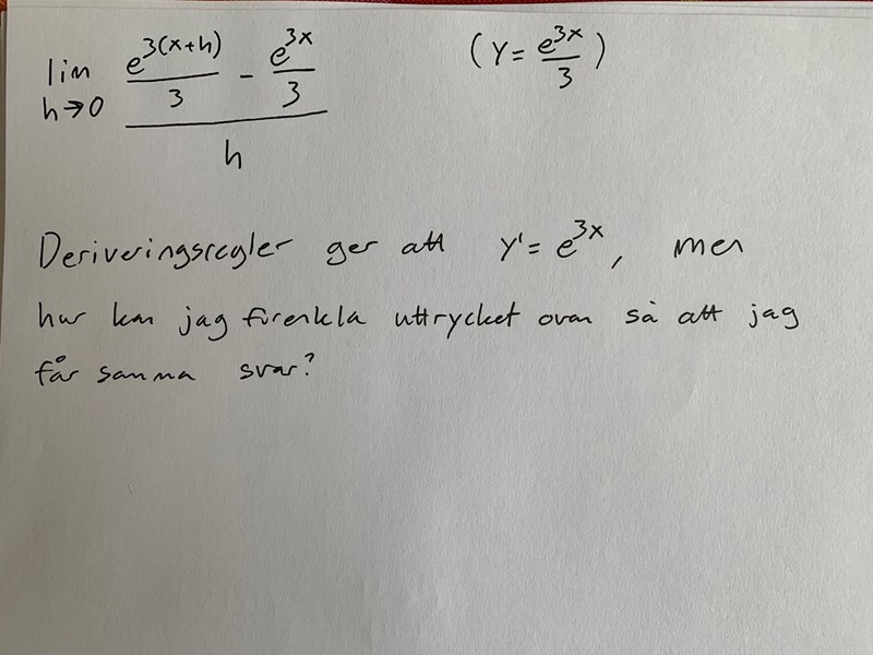 Jag stötte på detta uttryck i en uppgift som jag sedan löste med deriveringsregler men jag undrar om jag kan göra samma sak med differenskvoten. Tack på förhand!