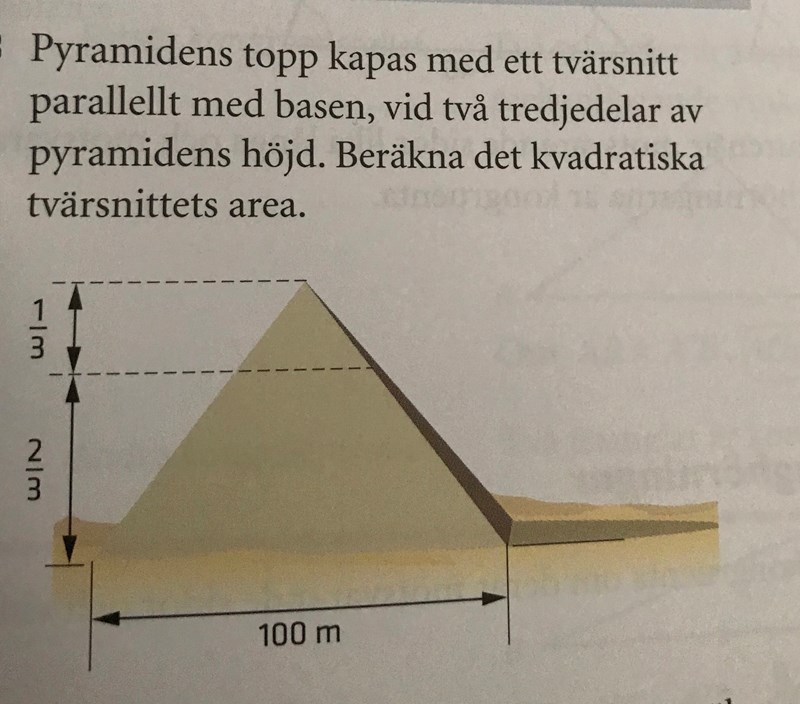 Jag tänker att pyramidens area helt är 10000 kvadratmeter. 1/3 betyder Ca33,3333 och gånger sig själv blir ca 111 kvadratmeter. Så tvärsnittet area blir ca 1100 kvadratmeter.