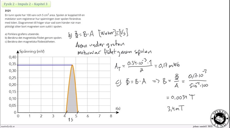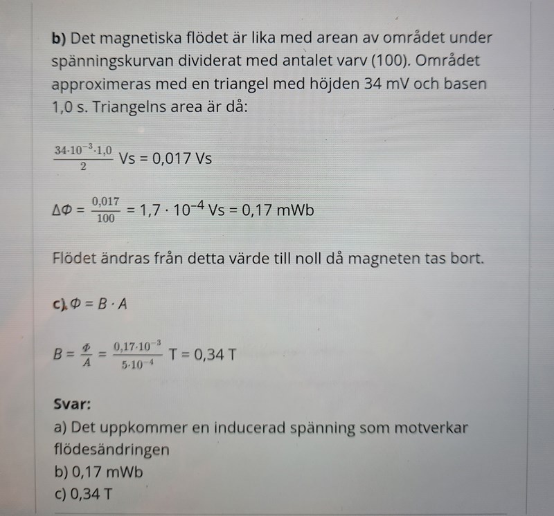 Arean kan uppskattas som en triangel med basen 1 s och höjden 34 mV. (34×10^-3)×1 /2 = (17×10^-3)Vs eller Wb och detta är det magnetiska flödet genom hela spolen. Varför ska man dela med antalet varv dvs. 100?