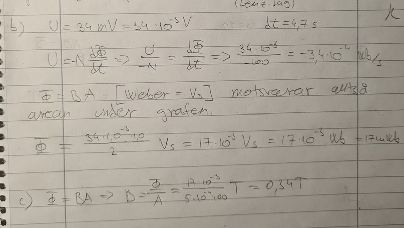 Om df/dt är lutningen på grafen så är f (flödet) arean under grafen. Och vi har ju den inducerade spänningen i grafen som är 34 mV. Dessutom har vi värdet för N (100) som är antalet varv också. Fast detta kanske är det maximala värdet för spänningen och vi kanske då behöver räkna ut det effektiva värdet istället?