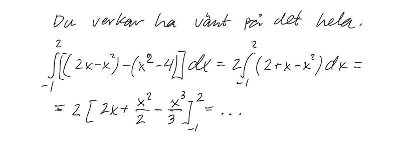 I det aktuella intervallet är y = 2x - x2 den övre funktionen.