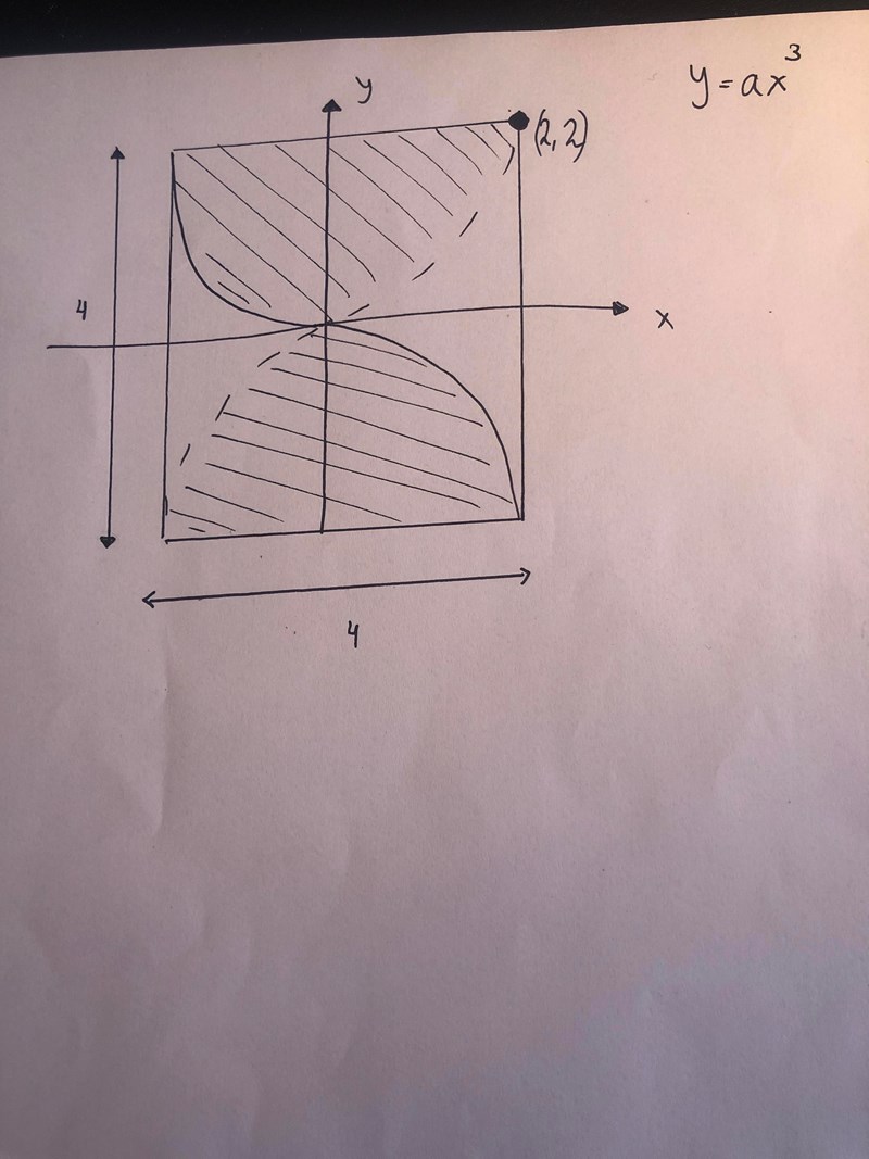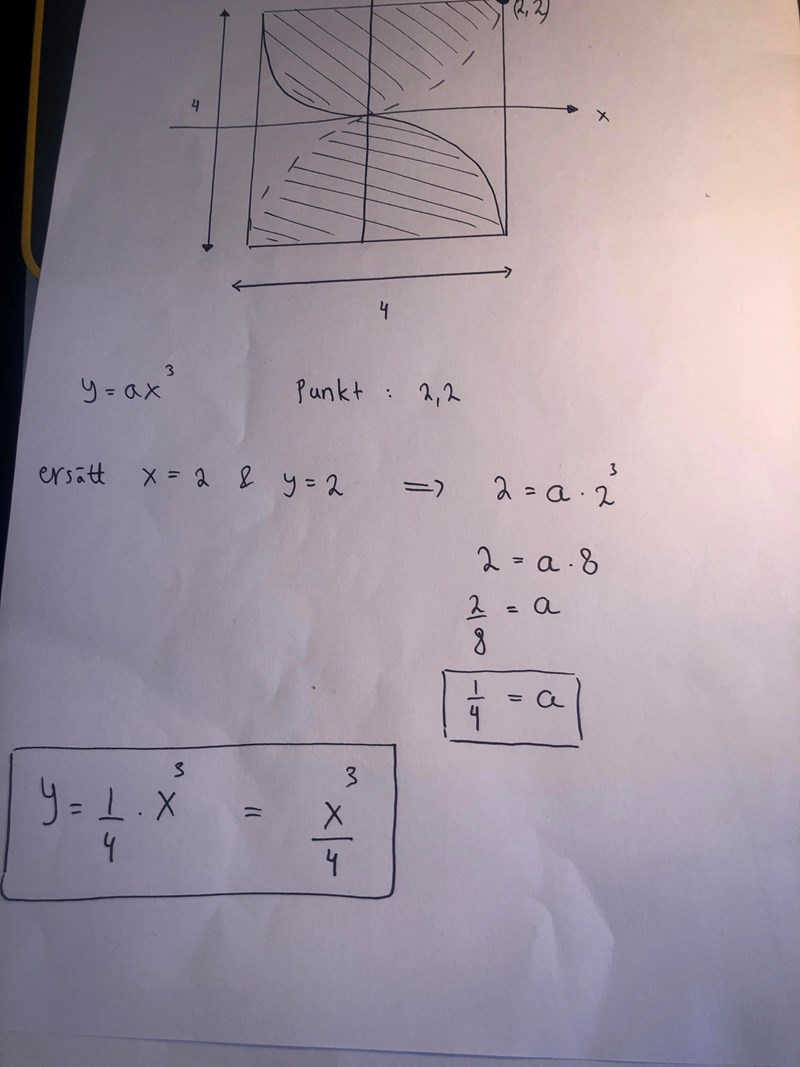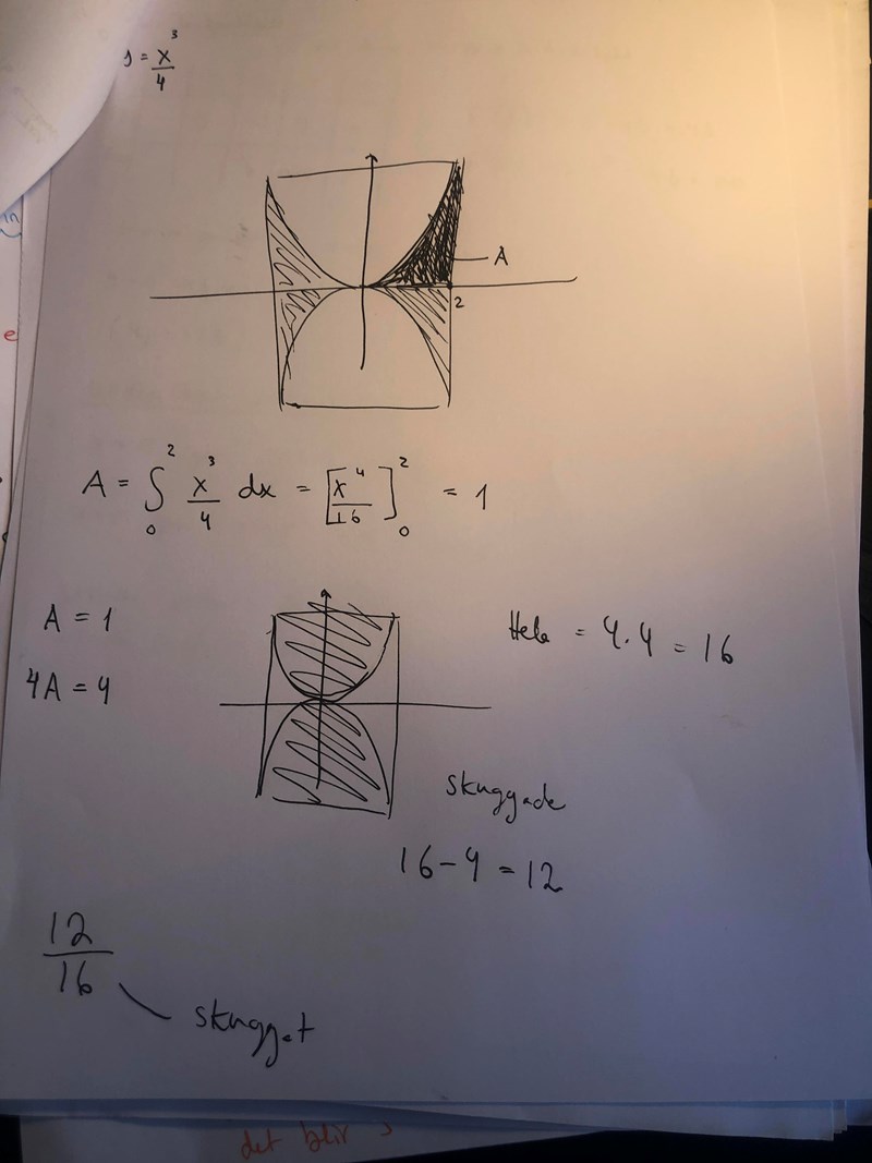 Det jag manade är att det är två funktioner som går ihop, tredjegradare. Varför räknar man bara ut arean vid den positiva x o y-axeln (första kvadranten)när det egentligen finns en bit till som också ligger under dvs kvadranten under den första.