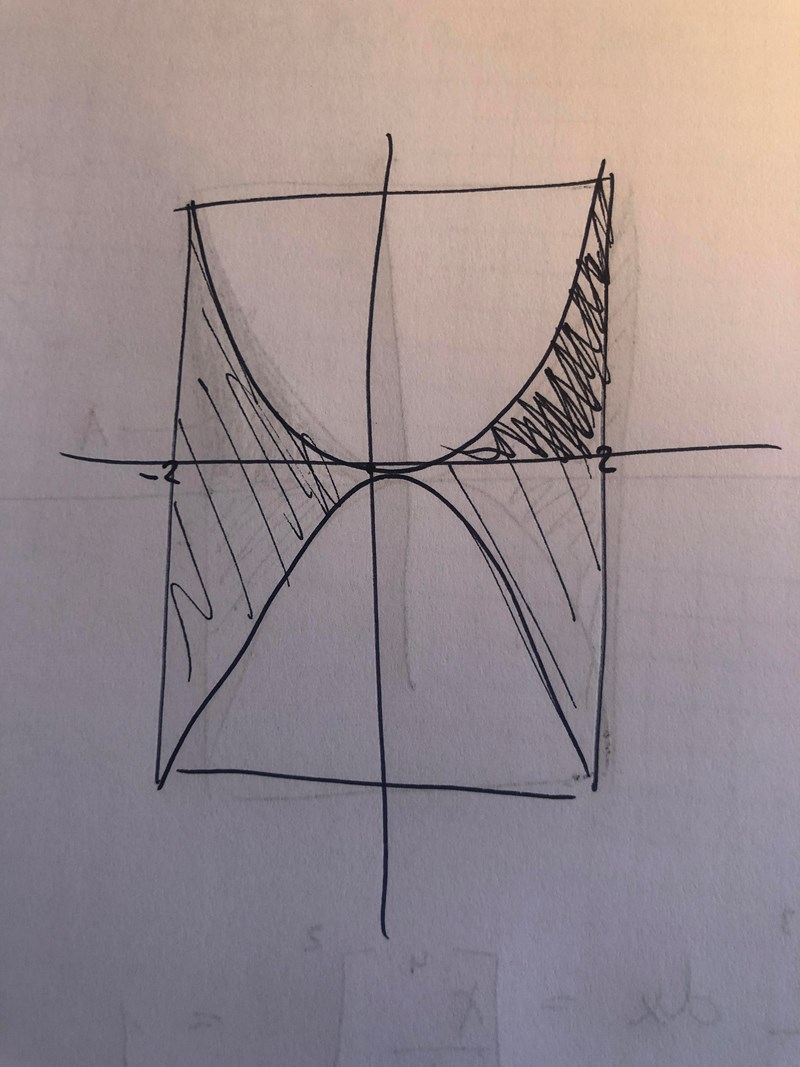 Ja men om jag går från 0-2 vart på min bild får jag ut för area. Är det det blåa partiet i första kvadranten som är arean? För det jag inte förstår är vilken arean vi räknar på då det är två grafer som går ihop.