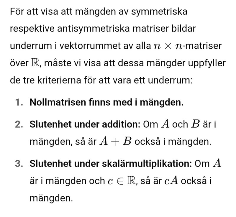 Visa att definitionen av underrrum är uppfylld. Dvs summan av två symmetriska (antisymmetriska) matriser är en symmetrisk (antisymmetrisk) matris. En symmetrisk (antisymmetrisk) matris multiplicerad med en skalär är en symmetrisk (antisymmetrisk) matris.