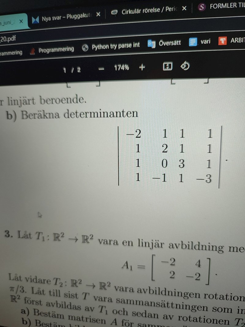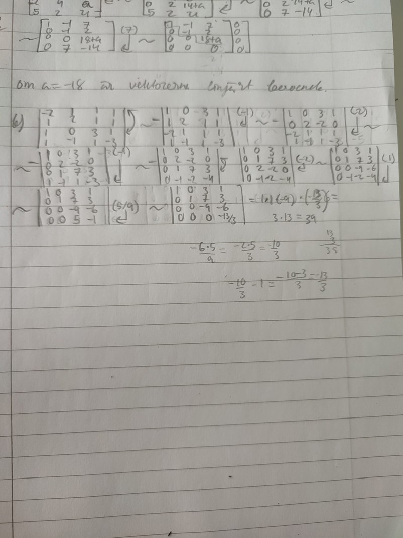Hej! Jag försöker lösa determinanten men lyckas inte få rätt svar:( har dubbelkollat mina uträkningar men ser inte var det blir fel?