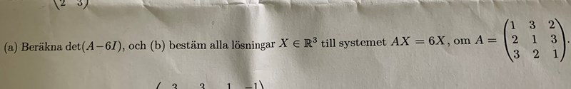 Som sagt. Du ska beräkna en determinant av en matris med storlek 3x3. Det är så grundläggande det kan bli att man tar upp det i de allra första kapitel i en linjär algebra 1-kurs. Om man verkligen har noll aning om hur man ska tolka det(A-6I) så tycker jag att det är dags att gå tillbaka och grundligt läsa om determinanter i sin bok. Du ska inte bara kunna beräkna en determinant, du ska också förstå vad en determinant är. Vad gör en determinant? Vad innebär det om en determinant är 0? Det finns många frågor till som skulle kräva mycket text och möda från personer här som du bara enkelt hade läst i en vanlig kursbok.