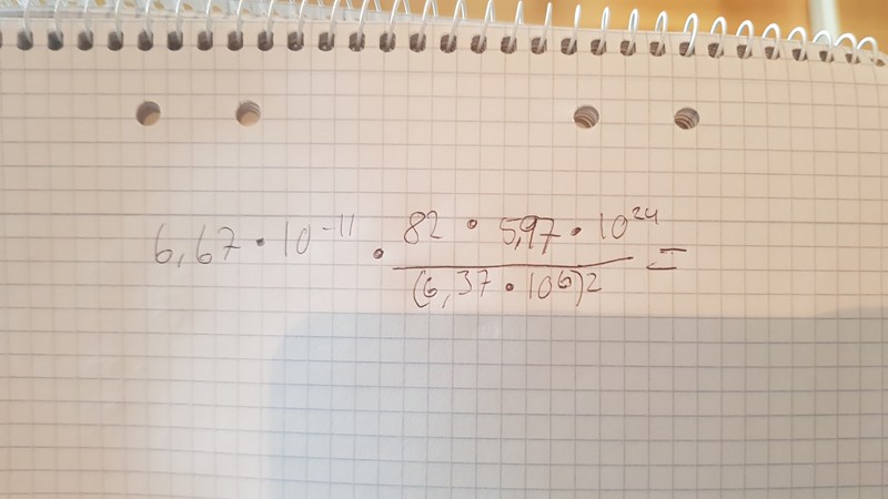 6.67×10^-11*82*5,97*10^24÷(6,37×10^6)^2 =804