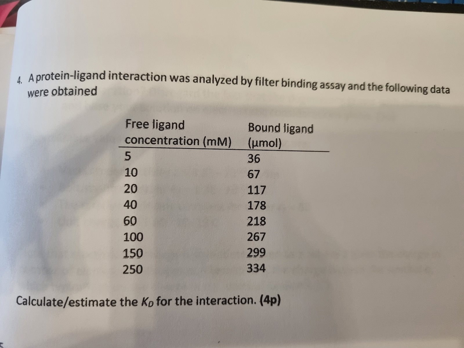 Och för att få full pott behöver du nog ange sambandet mellan 1/2 maxvärdet och Kd värdet, t.ex. genom ekvationen/reaktionen för dissociationen, med antagandet att förhållandet mellan ligand och protein är 1:1.