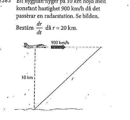 Ett flygplan flyger på 10km höjd med konstant hastighet 900km/h då det passerar en radarstation. Bestämdå r = 20 km