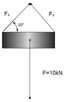 Från början känner vi inte till vad krafterna i bärlinorna är, vi kallar dem bara och . Däremot vet vi att de står och tittar på varandra och att de är lika stora (lika långa) (se figur). Vi vet bara inte hur långa de är. Däremot vet vi att deras komposanter i y-led måste bära upp lasten på 10kN. Annars råder inte jämvikt. Är du med på det?
