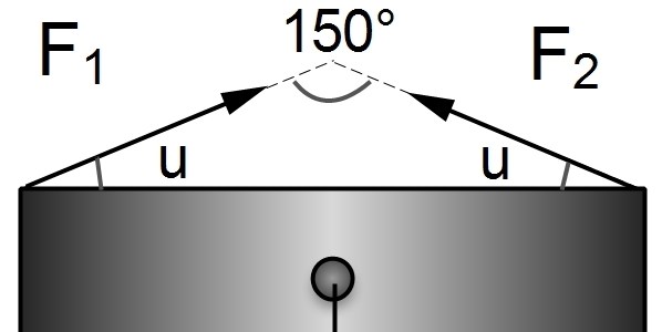 Nu måste du bara hitta vinkeln för de två fallen. Om vinkeln är 150 grader mellan snörena kommer de resterande två vinklarna att tillsammans vara 30 grader eftersom det är 180 grader i en triangel. Sedan måste de också vara lika stora, så vinkeln i hörnet är 15 grader. Sen är det bara att stoppa in värdena i formeln så får du svaret.