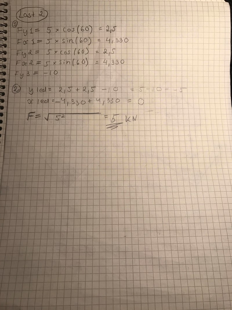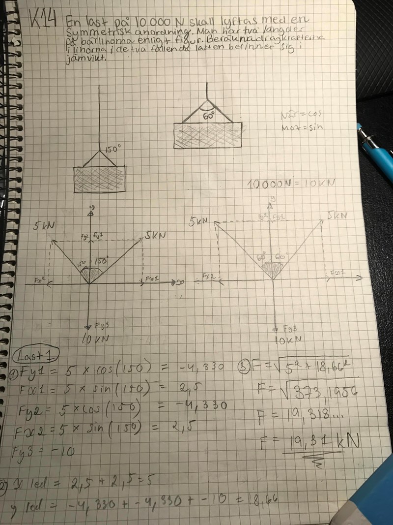 Du kan göra som du gjort och beräkna x och y komponenter men det är fortfarande så att y komponenten i vardera linan är 5 kN. X komponenten i vardera linan kommer att vara lika stor men i motsatt riktning så de tar ut varandra.
