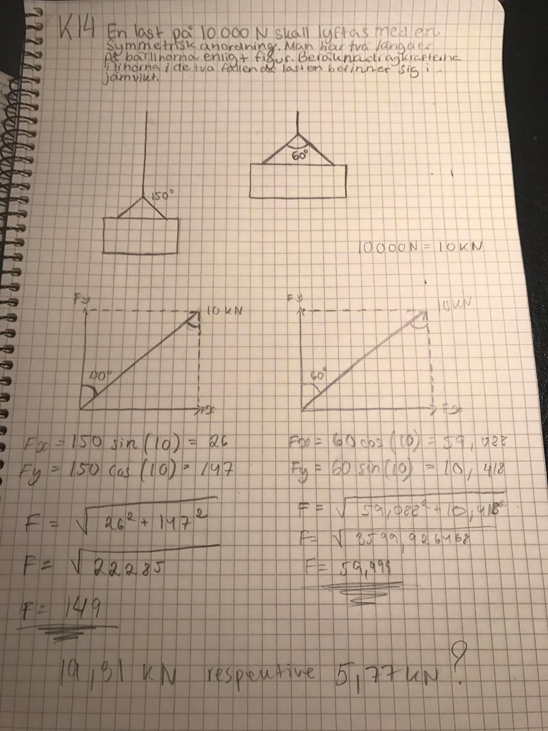 Jag har fattat nu hur man gör, och fick rätt kraft på första lasten 19,31kN. Men på andra lasten fick jag 5kN. Det ska vara 5,77kN men jag fick bara 5kN utan decimaler. Vad är det jag har gjort för fel?