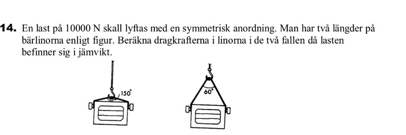 Mitt svar kommer likna de andra då det redan finns bra svar, men kan försöka ändå. Vi kan börja med Newtons andra lag. Den säger att om det inte finns nån acceleration så är den resulterande kraften noll, då har vi kraftjämvikt. Detta gäller i uppgiften då lasten är stillastående, vi måste dock ha kraftjämvikt i båda led, dvs vertikalt och horisontalt. Vissa krafter pekar inte i någon av dessa led men vi kan dela upp krafterna i dess komponenter . I denna uppgift kommer inte kraftjämvikten i horisontellt led vara relevant så vi tittar i vertikalt led.
