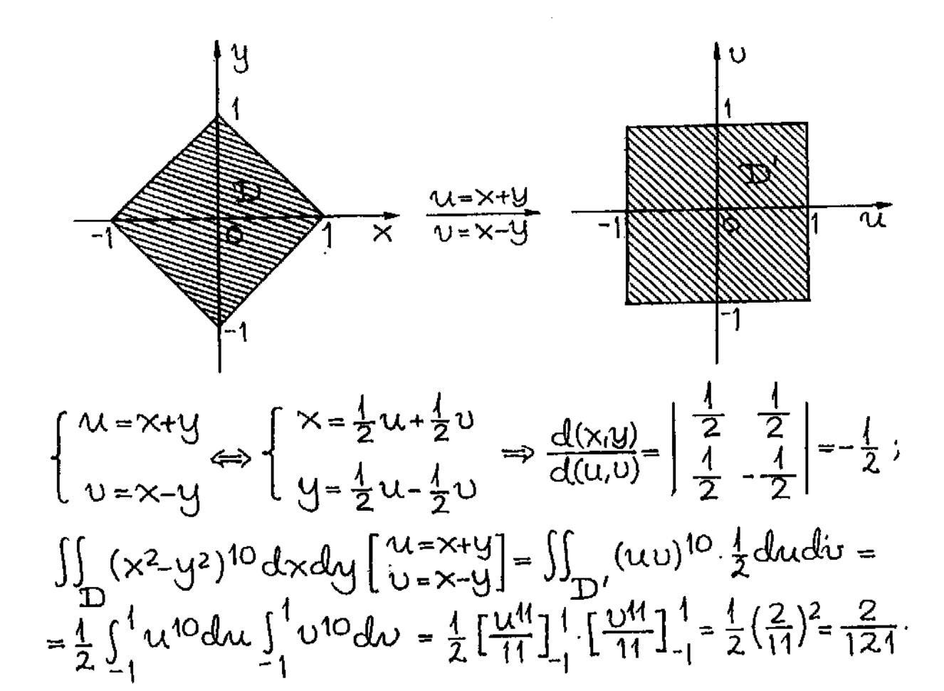 Jag förstår inte riktigt din omformulering av D, men bortsett från den så kan u+v inte vara rätt integrand över hela området. u+v är ju negativ på halva området.