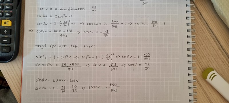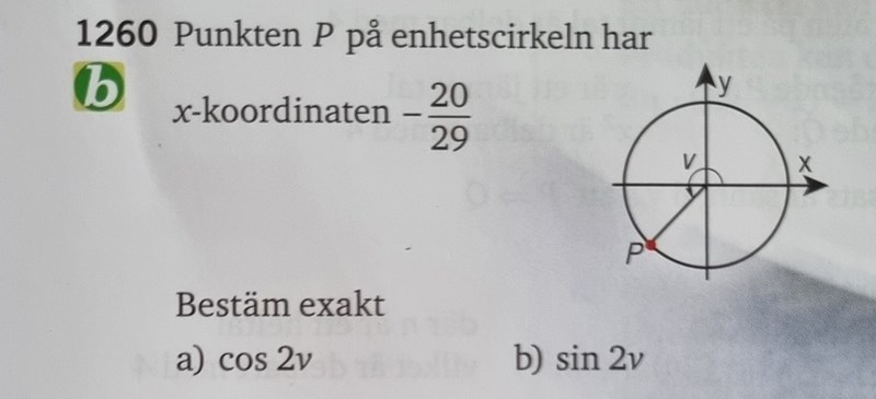 Jag ska lösa denna uppgift. Jag har löst cos2v med formeln cos2v = 2cos^2v - 1 men lyckas inte lösa sin2v.