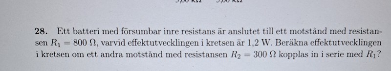 Tips: Räkna fram batterispänningen i stället. Tänk på att frågan gäller hela effektutvecklingen i kretsen, inte bara effekten i R2.