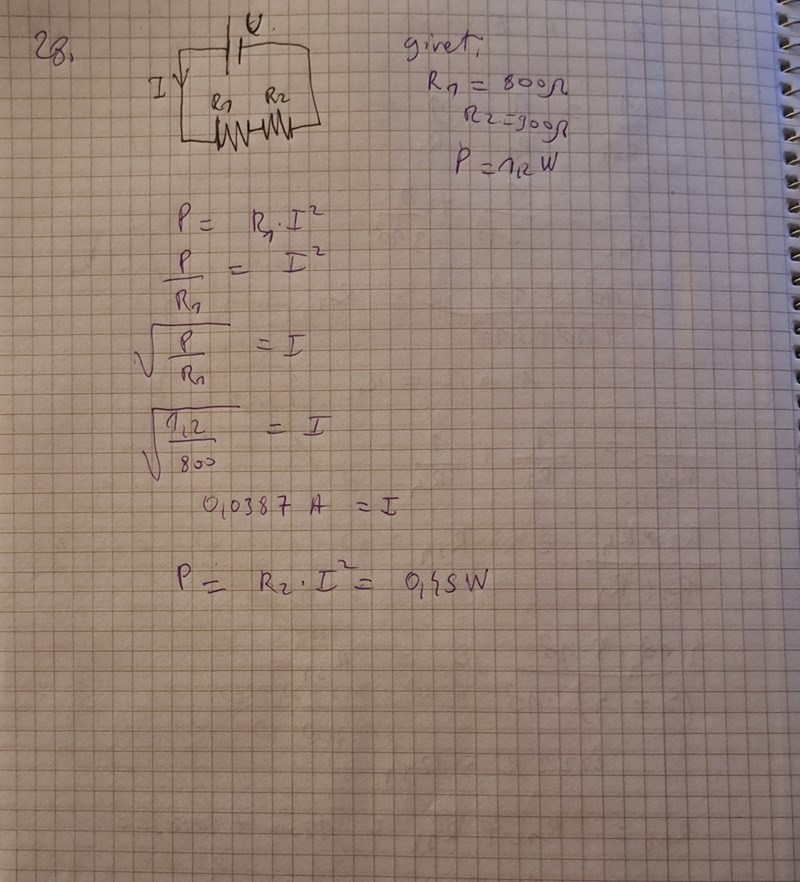 Jag fick fel svar här. Jag räknade strömmen då det var enbart R1 i kretsen innan den seriekopplades och sen räknade jag med R2 för att få fram effekten då strömmen är samma när de är i serie men mitt svar stämmer inte då.