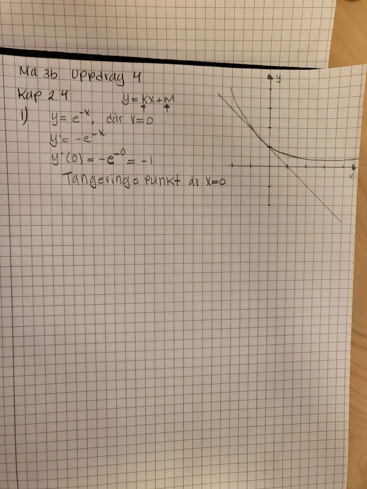 Bestäm ekvationen för tangenten till kurvan y=e^-x i den punkt på kurvan där x = 0