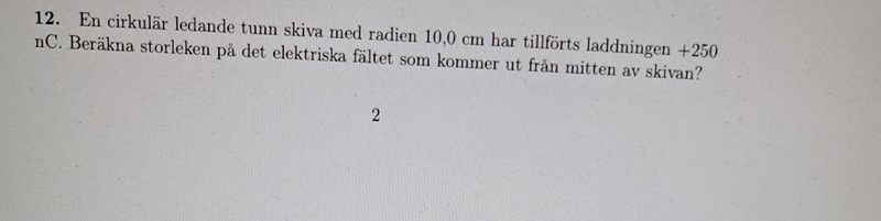 Om det hade varit en uniformt laddad skiva hade det inte ha varit så svårt att räkna ut ett värde, men nu är detta en ledande skiva. Kanske att situationen behandlas i din bok, då är det bara att leta upp en formel (kanske för laddningstätheten).