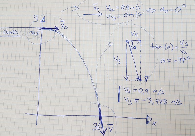 Jag har fastnat lite på en uppgift. Bollen faller över en bordskant som är 50,5 cm hög och landar 36 cm från bordet. Detta tar tiden 0,40 s. Jag ska beräkna dess begynnelsehastighet samt bollens hastighet till storlek och riktning när den slår i golvet. Jag antar att jag ska använda v=s/t för att räkna ut begynnelsehastigheten, men frågan är då om jag räknar ut vx eller v0? Jag ska väl sen räkna ut vy och sedan resultanten av vx och vy för att få bollens hastighet till storlek och riktning när den slår i marken eller?