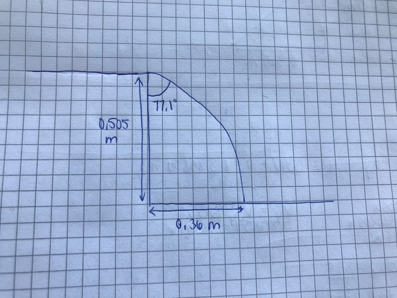 Du har angivit vinkeln mot lodlinjen och att vinkeln är 77,1° då bollen lämnar bordskanten.