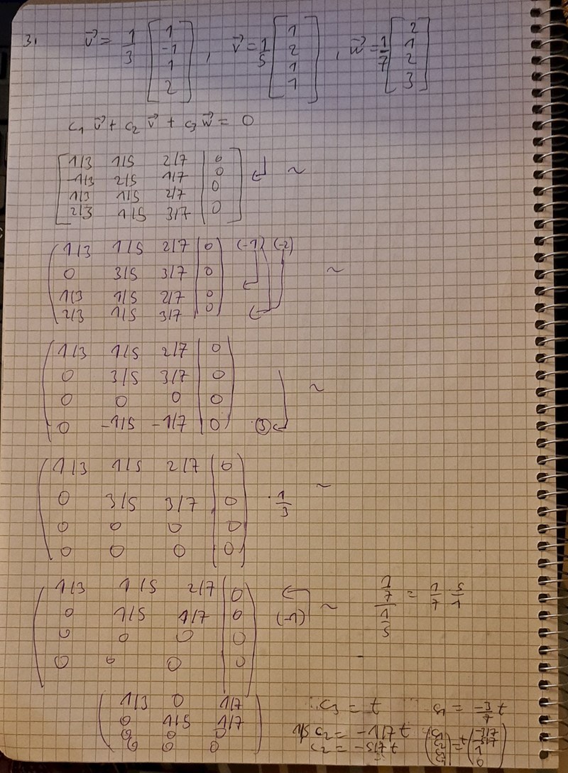 Okej så man ska kolla om u ,v och w är linjärt oberoende genom att göra en gauseliminering i a då ?