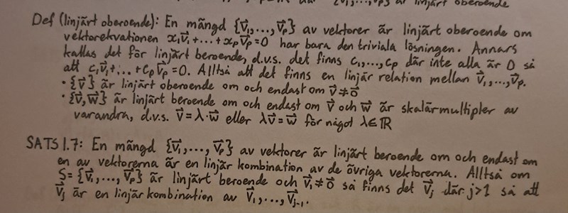 Vad menas med en icke-trivial kombination vs en trivial kombination om vektorerna är linjärt beroende /oberoende? I definitionen ovan säger de i ett stycke " alltså finns det en linjär relation." Då syftar man ju på linjärt beroende vektorer medan linjärt oberoende vektorer hade det varit en icke linjär relation.