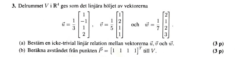 b) jo men nu är det liksom 3 vektorer i R4. Det är liksom lättare om vi har en punkt och en linje eller en punkt och ett plan som man kan bestämma avstånd mellan. Jag vet inte om vi ska skriva vektorerna i V som en ekvation för ett plan i parameterform.