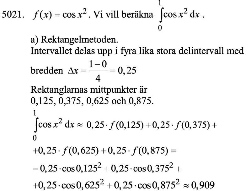 Detta ska lösas genom a) rektangelmetoden, där integranden delas in i intervallen 1≥x≥0 i fyra olika stora delintervall.